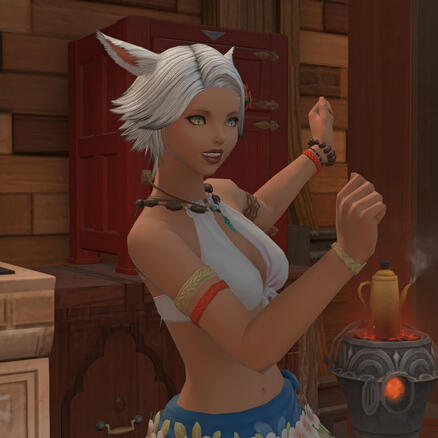 This is Lialle Iselin, proprietor of The Escape, a cozy cafe and bathhouse in Shirogane. Lialle is kind-hearted, sweet, and welcoming, whether helping her beloved girlfriend Ny'ope at Clemency or opening The Escape. Together, they eagerly welcome the new and old to their venues.